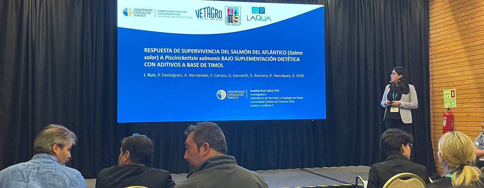 Asimismo, la investigadora postdoctoral Dra. Joceline Ruiz, afiliada al Centro de Investigación, Innovación y Creación (CIIC), presentó los resultados de una investigación desarrollada en el marco de la vinculación entre el Laboratorio de Nutrición y Fisiología de Peces UCT y la empresa europea VETAGRO, reconocida por su labor en el desarrollo de aditivos funcionales que promueven una producción animal sostenible.