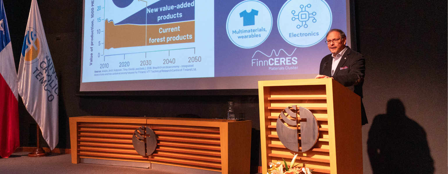 Durante su presentación, Orlando Rojas abordó el concepto de circularidad en el uso de recursos naturales, poniendo énfasis en el aprovechamiento de residuos y el desarrollo de soluciones innovadoras a partir de biomasa. “Lo que voy a hablar tiene que ver con el concepto de circularidad y de usar el recurso en una forma holística, sobre todo cuando hablamos de recursos naturales como forestales o marinos, con énfasis en los residuos lignocelulósicos y cómo generar valor a partir de ellos”, explicó.