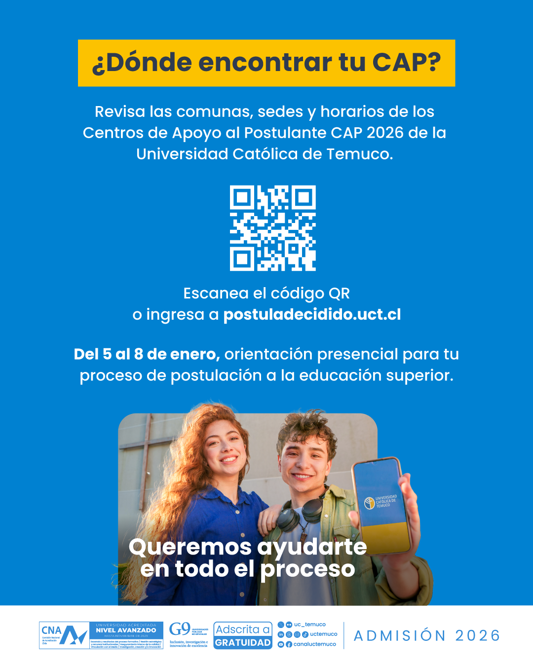 Las personas interesadas pueden revisar el detalle de comunas, sedes y horarios de atención en el sitio web postuladecidido.uct.cl, donde encontrarán toda la información necesaria para participar de esta instancia de apoyo.