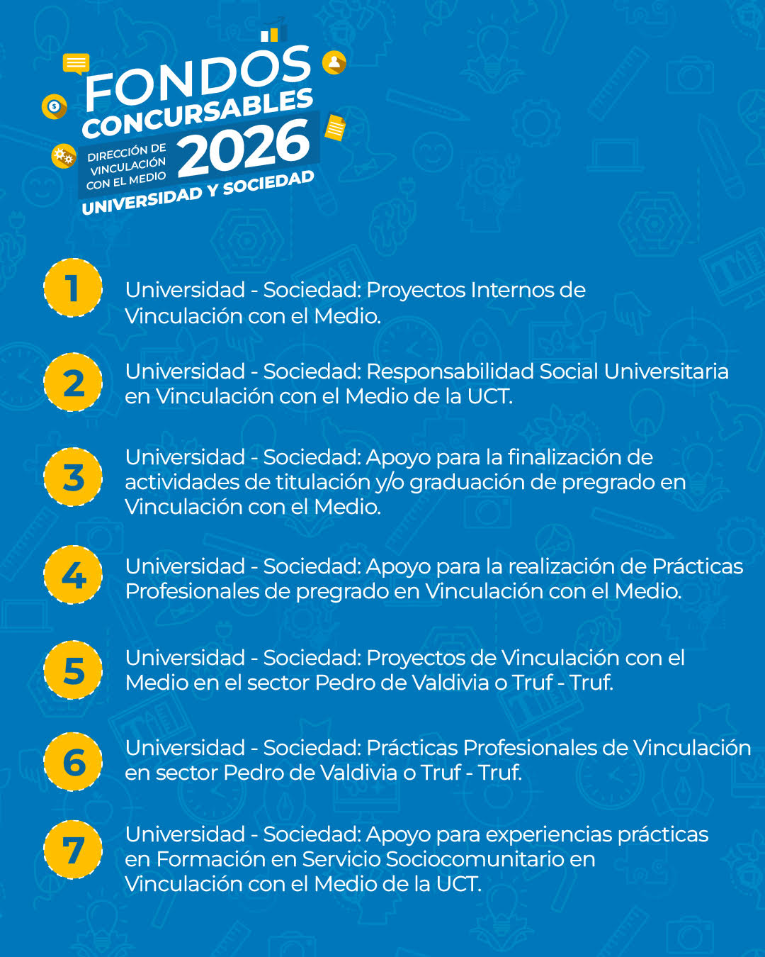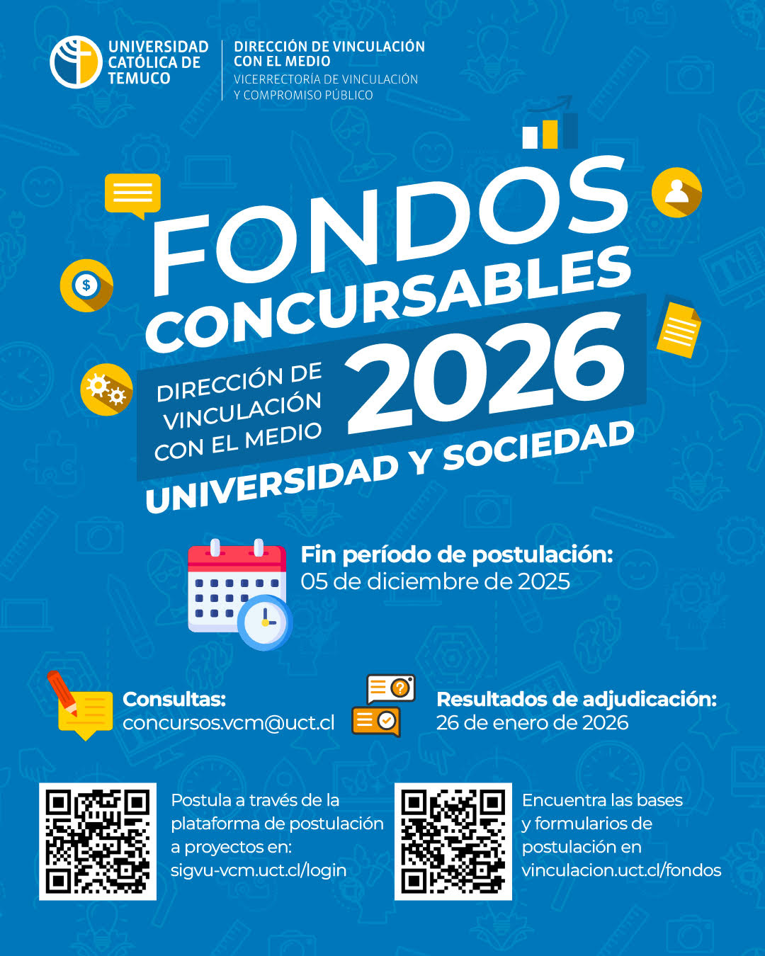 El concurso estará vigente hasta el 5 de diciembre del 2025, y los resultados de la adjudicación se darán a conocer el 26 de enero de 2026. Las postulaciones deberán realizarse en el siguiente enlace https://sigvu-vcm.uct.cl/login (plataforma habilitada desde el 3 de noviembre) utilizando las credenciales institucionales.