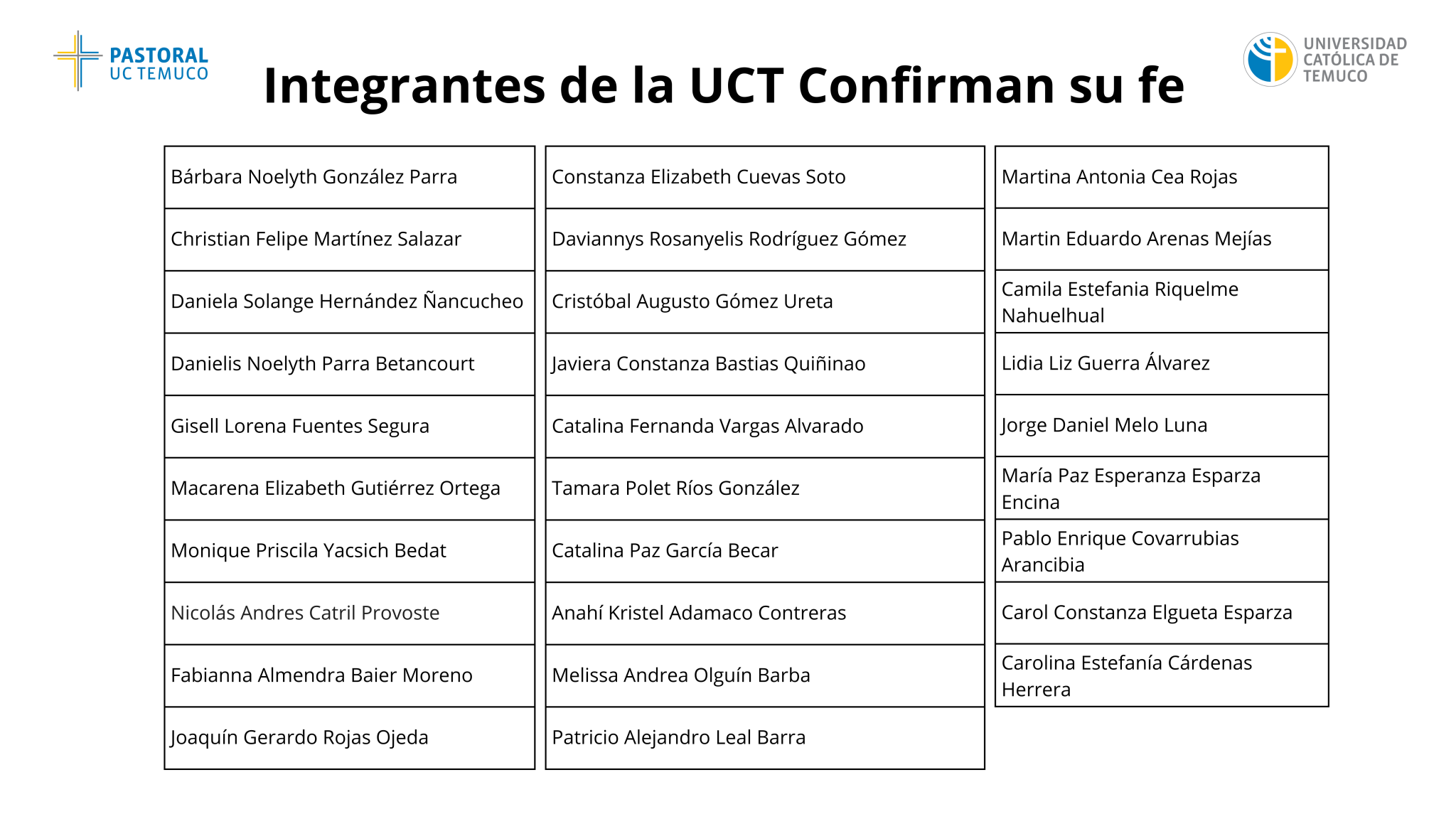 Joaquín Rojas, estudiante de Pedagogía en Lenguaje, enfatizó la importancia de comprender el verdadero sentido de este sacramento y su impacto en la vida diaria. Finalmente, Cristóbal Gómez, funcionario del Tec UCT, señaló que tras confirmarse desea “seguir ayudando a las personas y participar activamente en las instancias que ofrece la universidad”.
