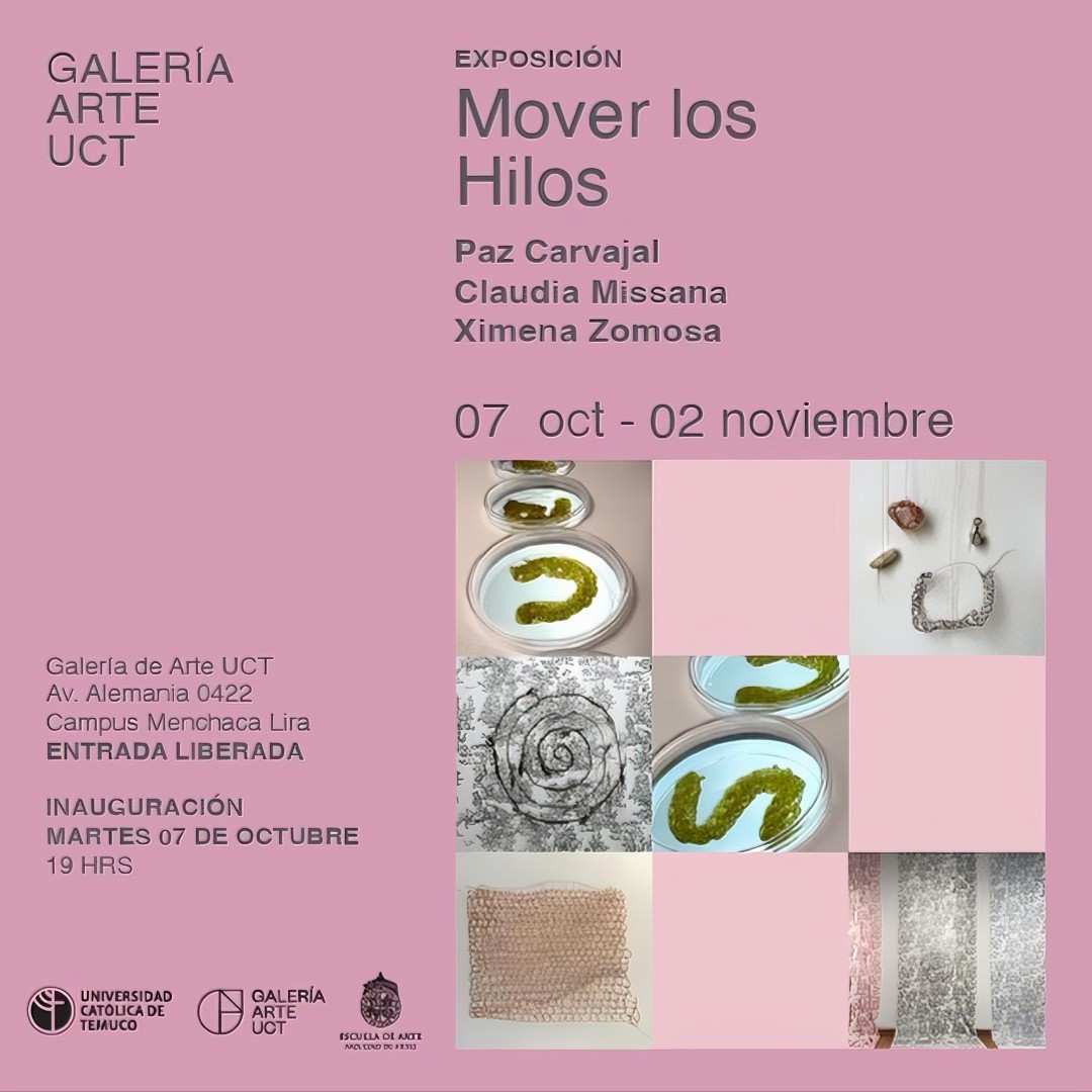 La Galería de Arte de la Universidad Católica de Temuco tiene el agrado de invitar a la comunidad a visitar la exposición Mover los hilos de las artistas Paz Carvajal, Claudia Missana, Ximena Zomosa, que se presentará entre el 07 de octubre y el 02 de noviembre de 2025 en el Campus Menchaca Lira.