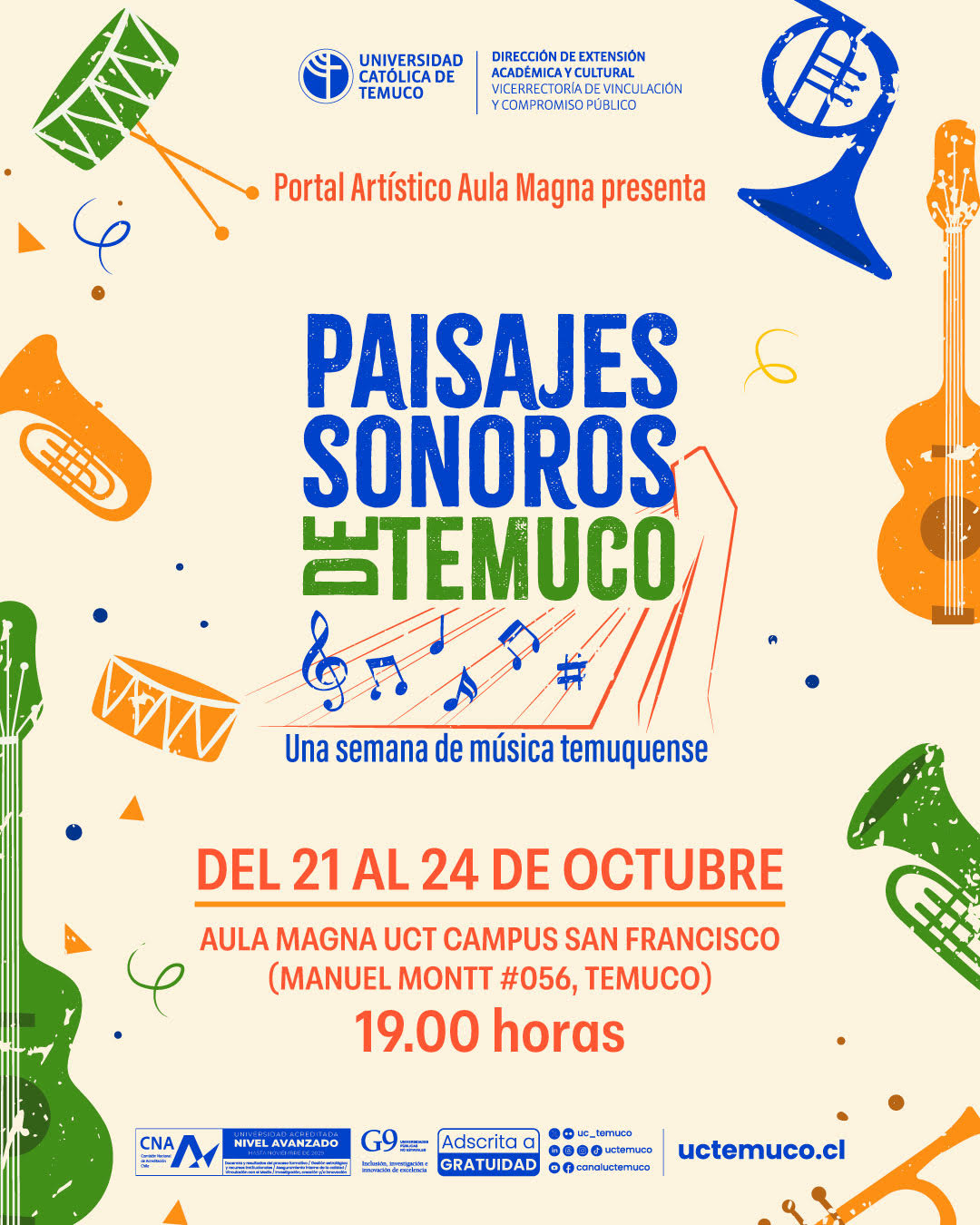La Universidad Católica de Temuco (UCT) invita a la comunidad a sumarse a “Paisajes Sonoros de Temuco: una semana de música temuquense”; ciclo gratuito que celebra la creación local y reúne a artistas y agrupaciones de distintos estilos.