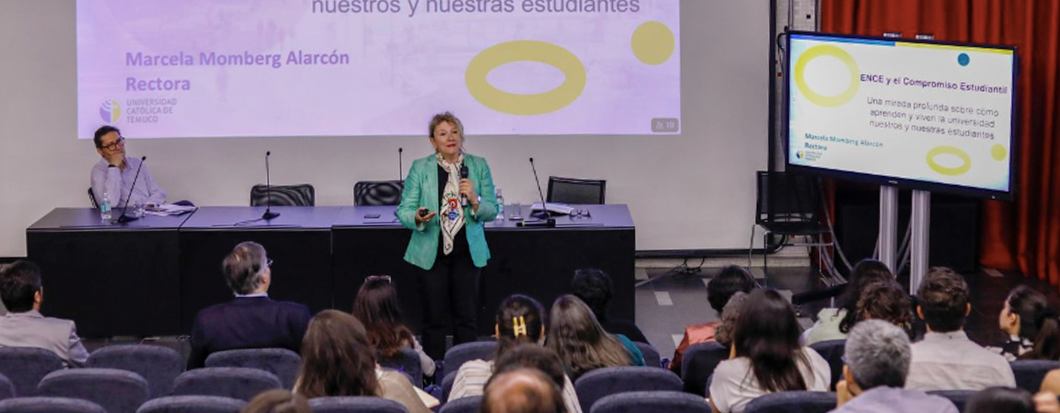 En la ocasión, la Rectora de la Universidad Católica de Temuco, Marcela Momberg Alarcón expuso sobre los principales alcances de la ENCE, destacando que “esta encuesta no se limita a presentar cifras, sino que es una oportunidad para que las instituciones fortalezcan el vínculo con sus estudiantes, optimizando su desarrollo académico y personal”.